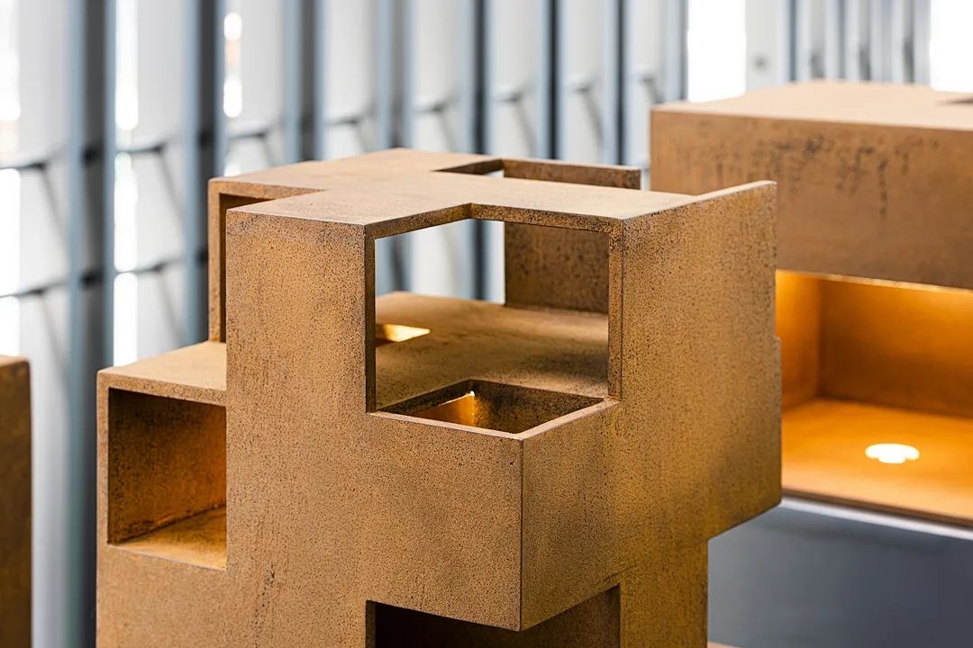 The reddish-brown steel, in the contrast of rough and delicate, cold and warm, soft and hard, condenses into a rich design context.